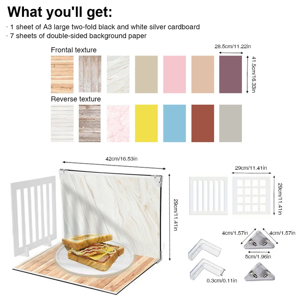 7Pcs 14Patterns Small Product Photography Backdrops Kit Food Photography Backdrop Board Table Top Food Background Kit for Food Jewelry Photo Shootings Features: 1.New Trendy Photo Backdrop Board: Unleash your creativity with this stylish photography setup, capable of assembling over 20 different patterns. for meeting all your photography needs. 2.What's Included: This small product photography backdrops kit features a 42x29cm board, including 1 A3 large foldable black and white silver card, 7 double-sided background papers, 2 plastic clips, 2 corner clamps, 2 grids, and 2 grid supports. 3.Premium Material: Crafted from quality cardboard, the food photography backdrop board is wrinkle-free, non-reflective, waterproof, dustproof, and color-accurate, providing a true-to-life 3D HD print. 4. Use: Ideal for creating stunning tabletop food background kit or geometric studio setups. Capture images of food, cosmetics, jewelry, accessories, makeup, skincare, etc., and share on social media. 5.Enhanced Live Streaming: Ideal for live auctions of jewelry and bags; enhances lifestyle diversity. Specification: Origin: Mainland China Black and white silver card paper folded size: 42*29cm Background paper size: 41.5*28.5cm Window pane size: 29*29cm Window pane bracket size: 4*4*5cm Corner clip thickness: 3mm Material: Plastic + PP + Paper Note: 1 x A3 Large Double-fold Black and White Silver Reflective Card Paper 7 x Double-sided Background Paper (front and back colors are inconsistent) 2 x Plastic Buckles 2 x Corner Blips 2 x Window Panes 2 x Window Pane Brackets